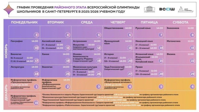 График проведения школьного этапа Всероссийской олимпиады школьников в Санкт-Петербурге в 2025/2026 учебном году